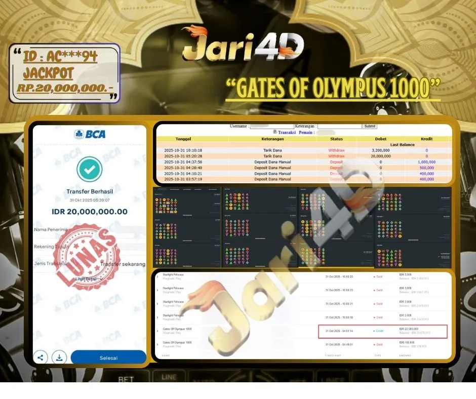 Bukti JP GATES OF OLYMPUS 100 Hari ini Di Situs JARI4D Sebesar Rp.20,000,000,- Tuntas !!