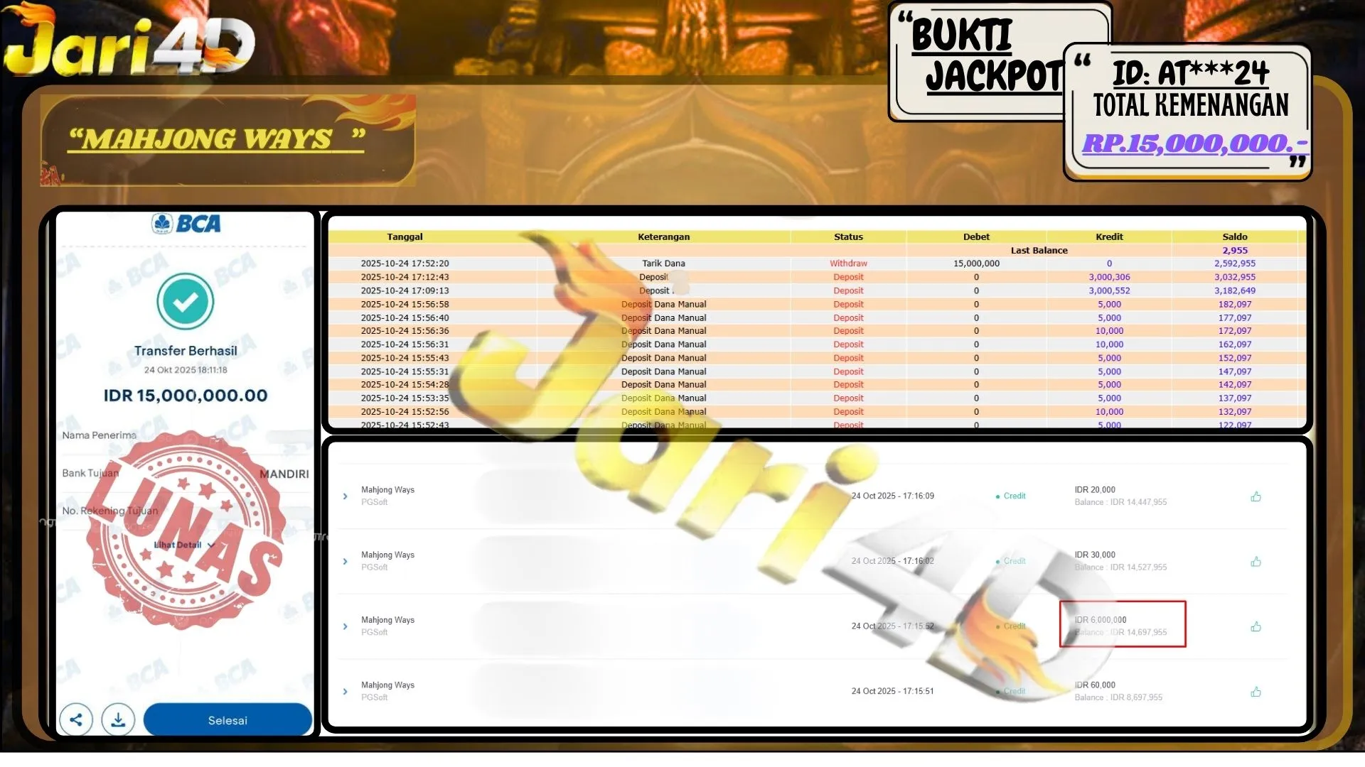 Bukti JP MAHJONG WAYS Hari ini Di Situs JARI4D Sebesar Rp.15,000,000,- Tuntas !!