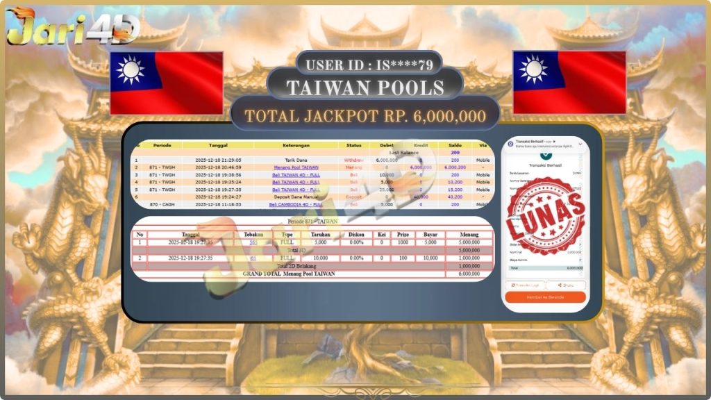Bukti JP TAIWAN POOLS Scatter Hari ini Di Situs JARI4D Sebesar Rp.6,000,000,- Tuntas !!