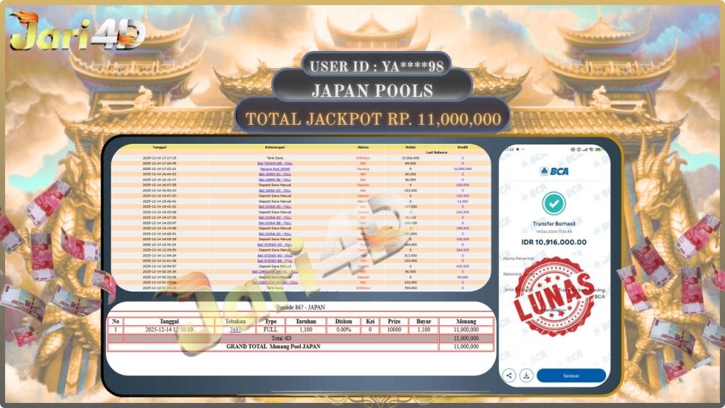 Bukti JP JAPAN POOLS Hari ini Di Situs JARI4D Sebesar Rp.11,000,000,- Tuntas !!